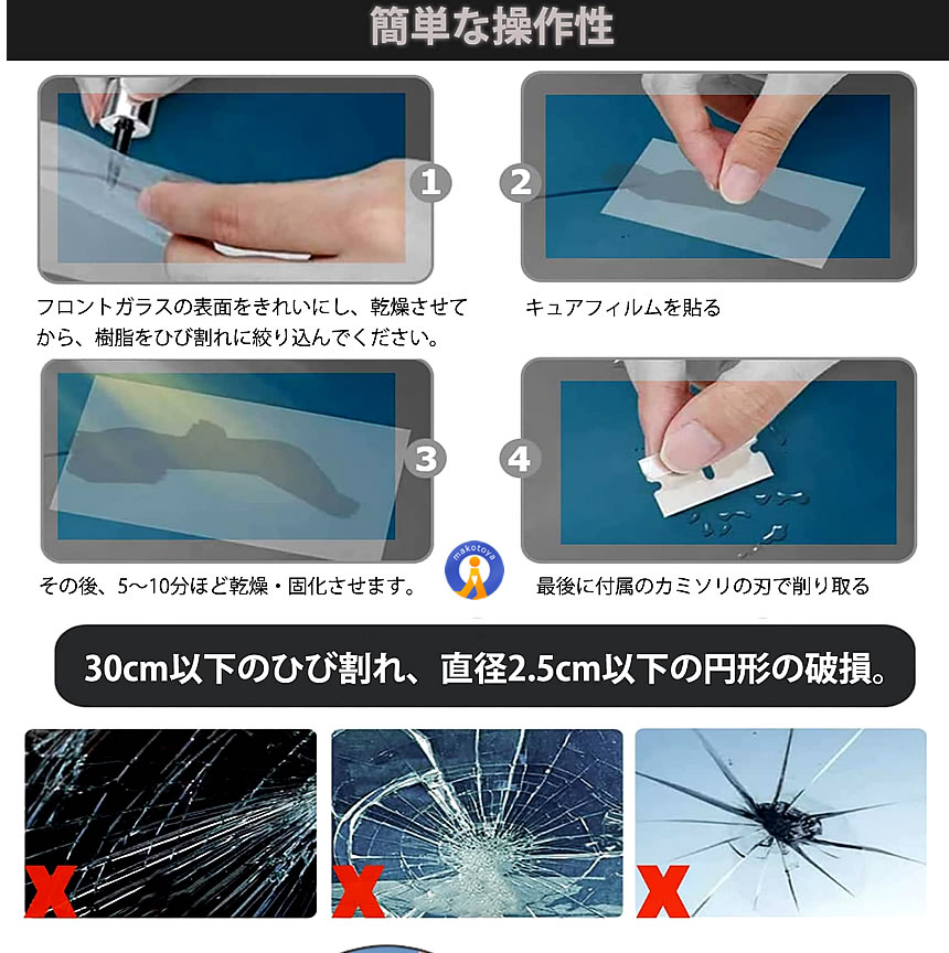 日本語の説明書も付属でかんたんにガラスの修理ができます。