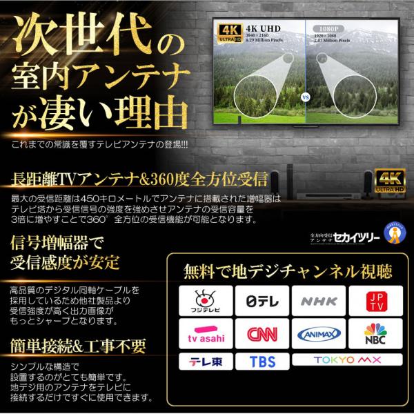 テレビアンテナ 全方位受信 室内アンテナ 地デジアンテナ ブースター 増幅器 360度 450KM受信範囲 SPACETREE