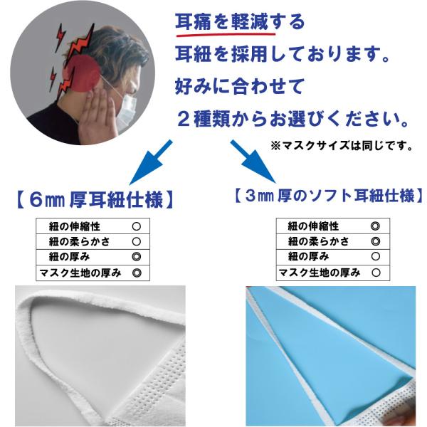 耳が痛くならない6mm幅の平ゴム型耳紐or3mm厚ソフト耳紐を採用し耳痛も軽減します。