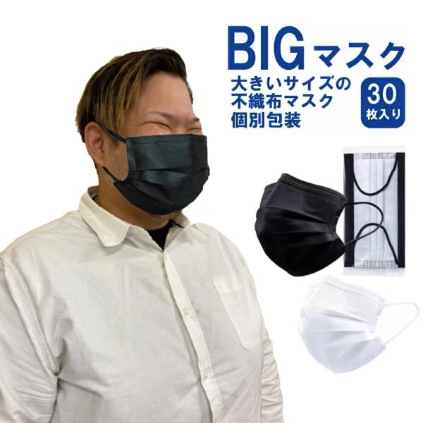 大きいサイズの不織布マスク 21cm ホワイト ブラック マスク 大きなマスク 3XL サイズ 個別包装 3層構造 プリーツ 耳に優しい紐 30枚 フェザーストア