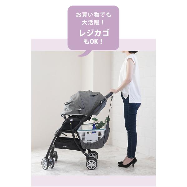 ママとベビーカーの間のスペースを利用しているから、荷物を載せてもベビーカーが倒れにくい。