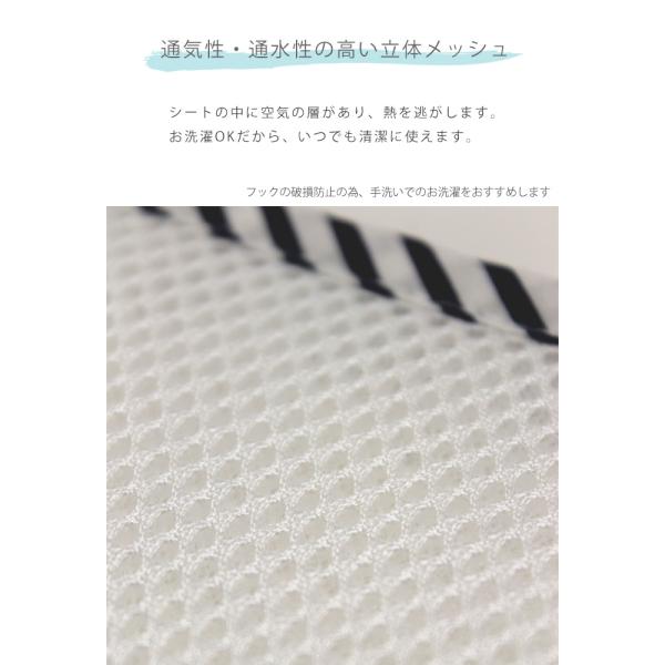 通気性に優れた立体メッシュ素材で、背中の蒸れやべたつきを軽減します。
