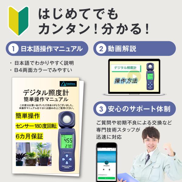 はじめてでもカンタン分かる!簡単操作マニュアルは丁寧な日本語説明・B4両面カラーだから分かりやすく、使用/設定方法/電池の交換方法まで丁寧に手順説明。屋内の照度環境の参考のため照度基準表も記載しております。さらに、操作方法の動画解説で視覚的に理解することができます。
