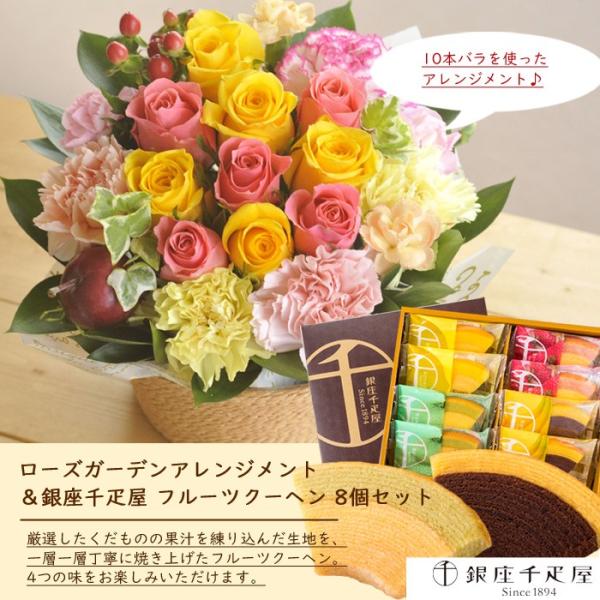 花とスイーツのセット ローズガーデンアレンジと【銀座千疋屋】フルーツクーヘンギフトセット 誕生日 記念日 お祝い花 即日発送 あすつく FKAA