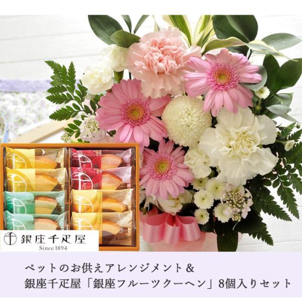 お供え花とスイーツのセット ペットお供えアレンジ+千疋屋フルーツクーヘン8個入りセット 即日発送 あすつく お悔み FKAA
