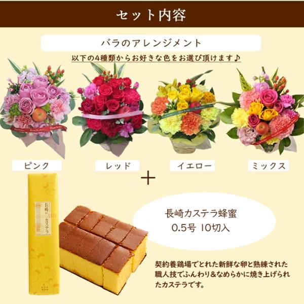 花とスイーツのセット バラアレンジメントと 長崎カステラ蜂蜜 0.5号 10切入 誕生日 記念日 お祝い花 即日発送 あすつく プレゼント お取り寄せ FKAA
