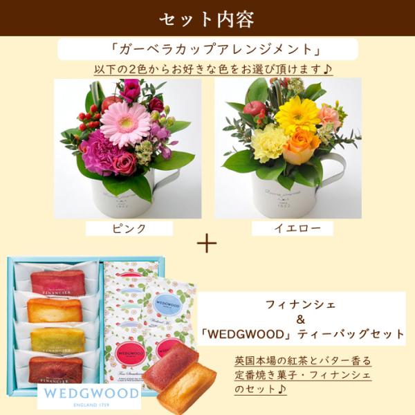 花とスイーツのセット ガーベラカップアレンジ と WEDGWOOD(ウェッジウッド) 紅茶&フィナンシェ セット 即日発送 あすつく FKAA