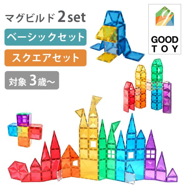特典♪シール付 2点セット マグビルド ベーシックセット+スクエアセット ブロック 磁石 マグネット パズル セット 3歳〜 手作り 知育玩具 おもちゃ 海外×