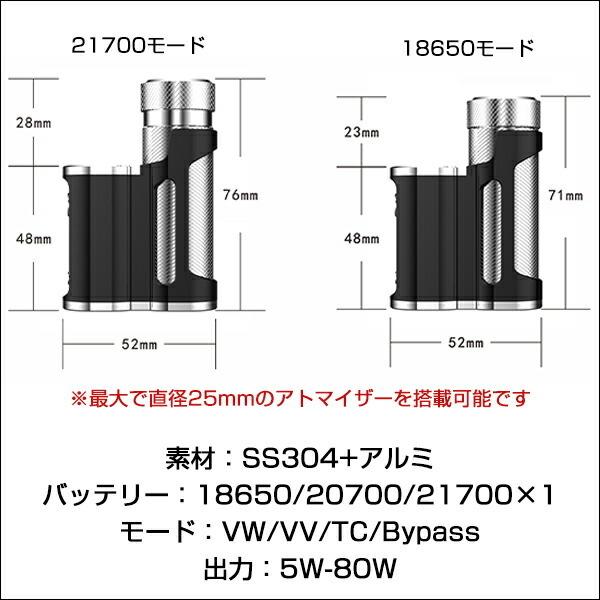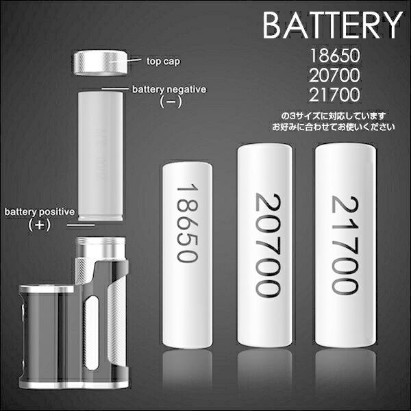 18650・20700・21700バッテリーいずれか1本で駆動するシングルバッテリーMODで、VW・VV・バイパス・温度管理、全4種類の出力モードが選択可能です。