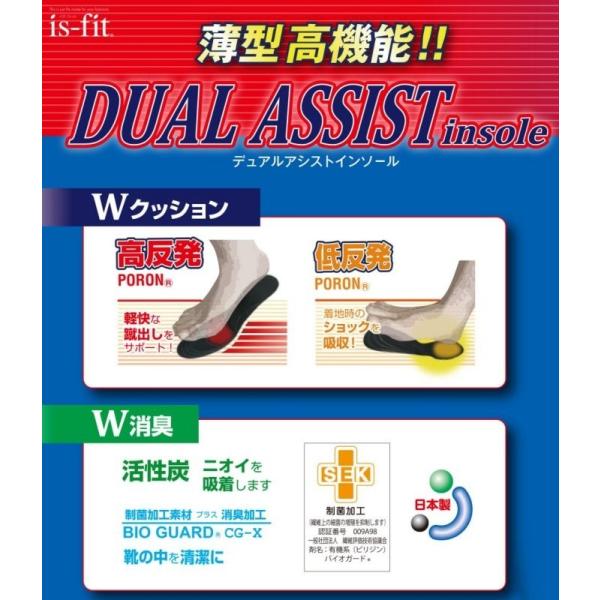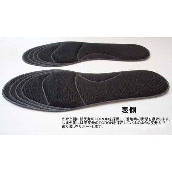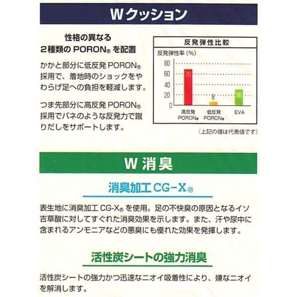 かかと部分に低反発のPORONを採用して着地時の衝撃を吸収し、つま先部には高反発のPORONを採用してスムーズな蹴り出しをサポートします。