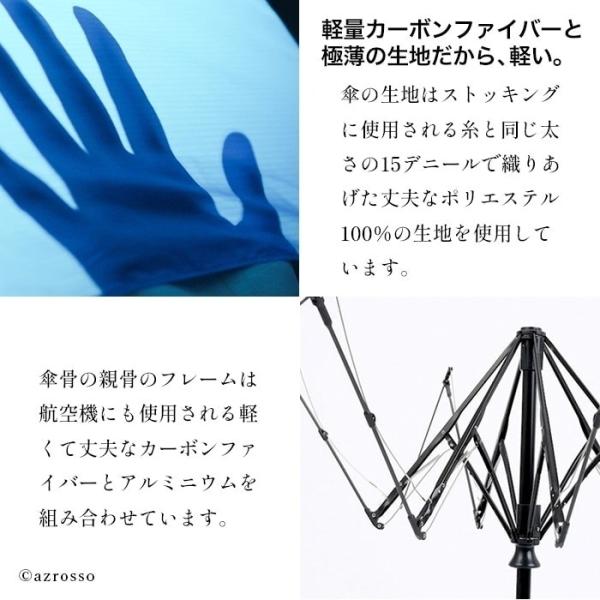 傘の生地はポリエステル100%、フレームは傘骨の親骨部分にはカーボンファイバーを採用し、一般的な折りたたみ傘と比べ、重さはたったの164gと驚きの軽量。