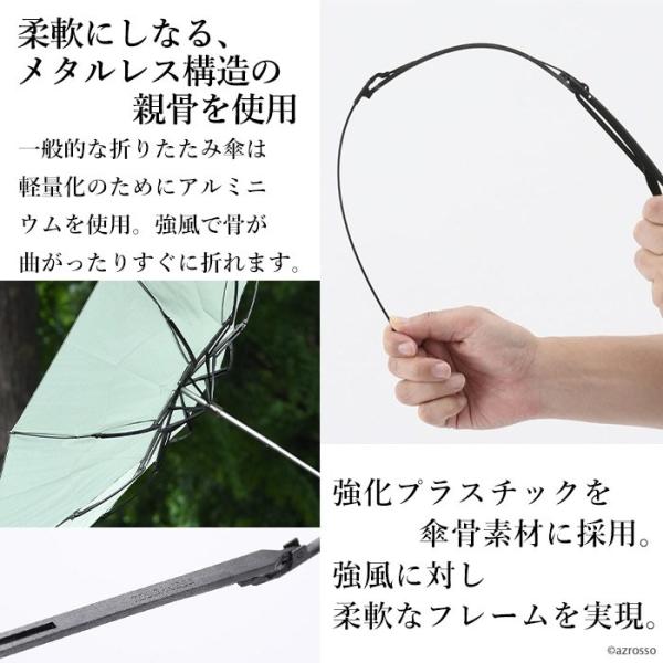 折りたたみ傘はコンパクトだけど、すぐ壊れがちを覆す「タフネスミニ TOUGHNESS MINI」。台風級(風速15m/s)に耐える丈夫な傘を作ろうとすれば、硬くて太い素材を選択する必要があり、製品重量が重くなります。アンベルは重くなくて強風に耐える構造を目指し「風をいなす」傘を開発。一般的な折りたたみ傘は軽量化のためにアルミニウムを使用。強風で骨が曲がったりすぐに折れます。強化プラスチックを傘骨素材に採用。強風に対し柔軟なフレームを実現。強風時の外出や営業回りでひっくり返っても戻るので安心です。アンベルが独自開発したナノテク強力はっ水コーティング『EASY DRY』。繊維の奥深くまでコーティングが浸透し剥離しにくく、撥水力が長期間持続します。