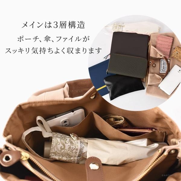 小さめ(ミニバッグ)ながら、使い勝手の良い3層構造+たっぷりマチの大容量のトートバッグは、A4・B4サイズの書類やタブレットも収納でき、大きめファスナーポケット付きで貴重品も安心。