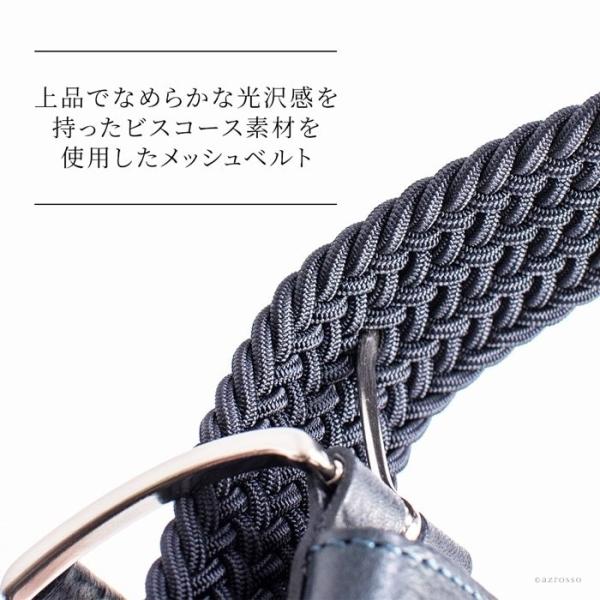 上品でなめらかな光沢感を持ったビスコース素材を使用したメッシュベルトは、身に付けるだけでカジュアルな着こなしをクラスアップ。