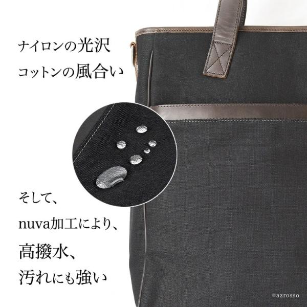 ナイロン特有の安っぽさを軽減、コットンで難しい撥水、防汚を実現した新時代の縦型ビジネストートバッグ。