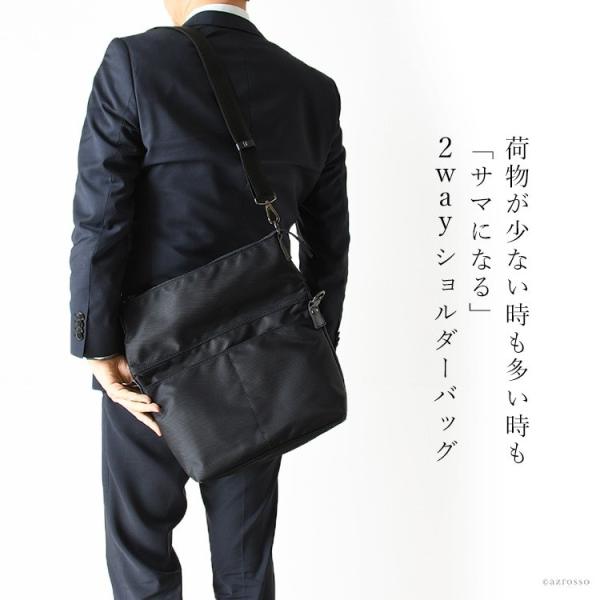 縦長スタイルに変形させると、A4の書類が楽々収納でビジネスショルダーバッグとしても最適。