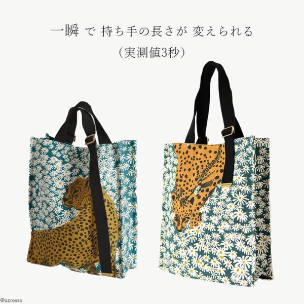白き花舞う草原の中に孤高に佇むチーターと、大草原を駆け抜けるシマウマ。アフリカの広大な自然風景を彷彿とさせる迫力あるハイセンスな柄は両面(前面後面)や左右の側面や底まで。どこから見てもオシャレさが失われないバッグ。