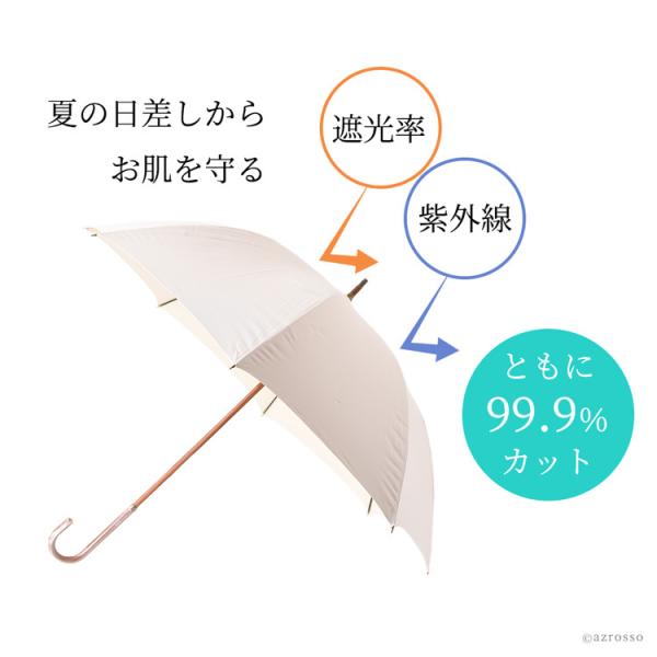シンプルな8本骨の晴雨兼用傘(長傘)。UVコーティング加工を施し紫外線カット率99%、遮光率99.9%の一級遮光。ネイビーは遮光率100%の完全遮光を実現。