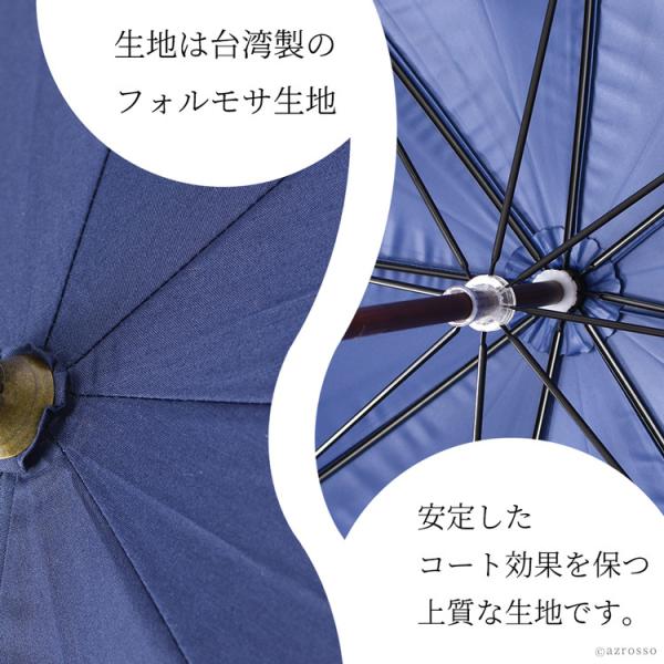 「フォルモサ」という台湾製の生地を使っており、日傘として安定したコーティング効果を維持する高品質な生地のおしゃれな傘です。コットン(綿)を配合した程よい厚みのあるマットな風合いの生地感は、シックな着こなしによく似合う。木製の中棒と手元が傘全体を落ち着いた大人な雰囲気に。無地でシンプルなデザインなのでスーツやカジュアル様々なコーデに合う使いやすい傘です。