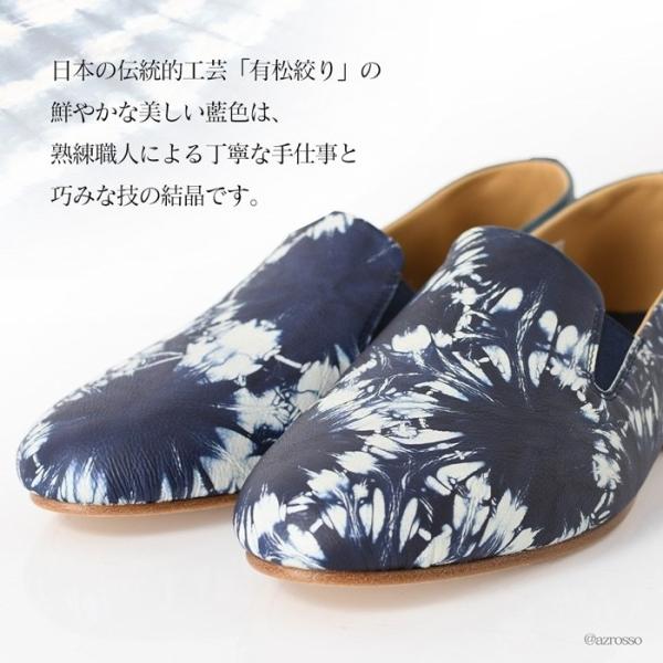 美しく涼やかな表情が魅力の有松絞(寝巻絞り)をカーフレザーに施し、ひとつとして同じ柄の無い贅沢なレザースリッポン。足入れがスムーズで履きやすく、マッケイ製法で歩きやすい。上質な国産カーフレザーのため足にストレスなくフィットし、ソールには柔らかいイタリア製革底で、やみつきの履き心地。