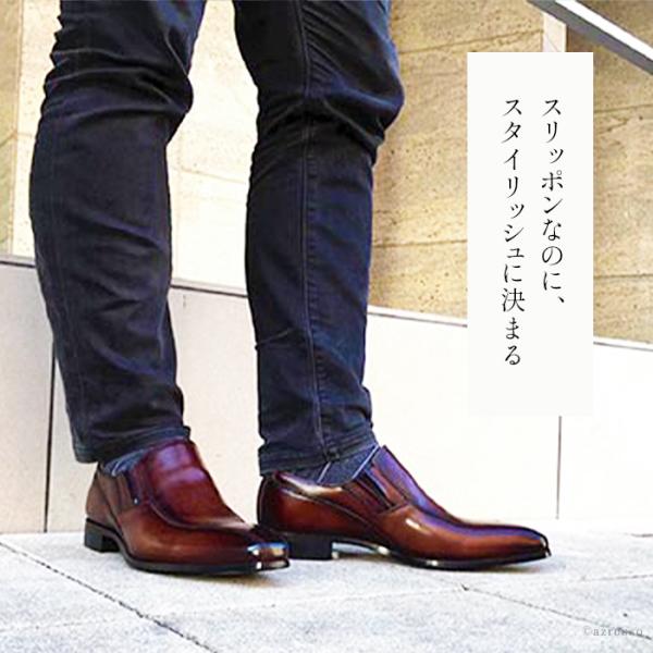 紐がなくて履きやすいのに、上質レザーで高級感あるスリッポン型ビジネスシューズは、20代,30代,40代,50代,60代,70代の大人の男性に履きやすくて人気です。誕生日、記念日、父の日、敬老の日、クリスマスのギフトやプレゼントにもおすすめ。