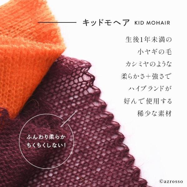 生後1年未満の小ヤギの毛で、大変稀少なキッドモヘアを使用。カシミヤのような柔らかさ+強さでハイブランドが好んで使用しています。その独特の細く柔らかな毛は、ふわふわ抜群の暖かさで、チクチクすることもなく、お肌が敏感な方にもオススメ。