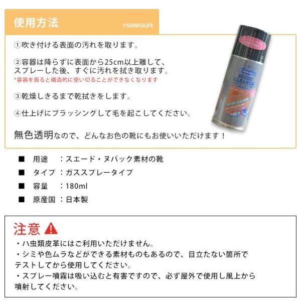 スエードやヌバック素材のムートンブーツ、ビジネスシューズ、カジュアルシューズや、レースアップブーツなどの表面の、汚れが気になるところに直接クリーナースプレーをシュッとして、布でふき取るだけ。これだけで、あっというまにスエードやヌバックの汚れがキレイになります!