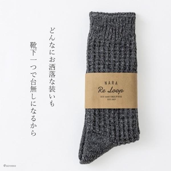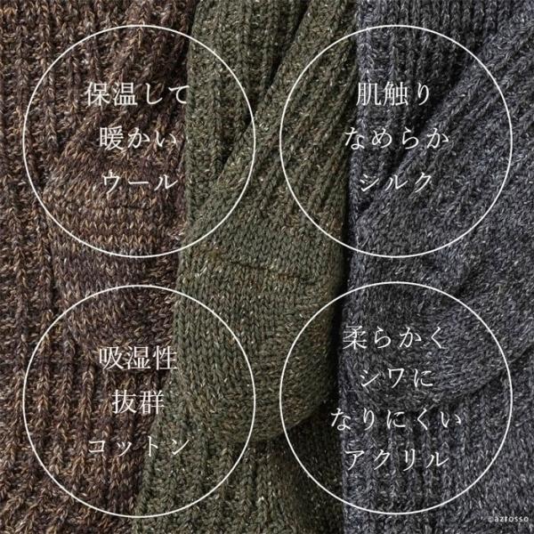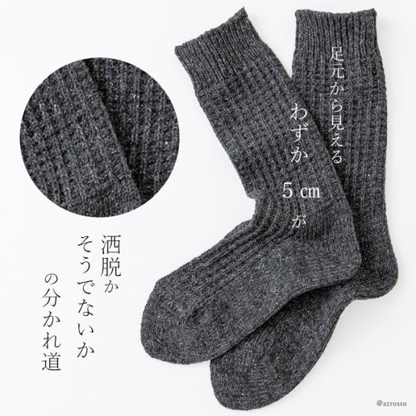カジュアルソックスのイメージのローゲージくつ下では、中々目にすることのない、高品質の天然素材をたっぷりと贅沢に使用し、丁寧にゆっくりと編み上げた靴下。ウール、シルク、アクリル、コットンなどの混紡糸をミックスしながら特徴的なワッフル地に編みあげたツイード調のソックス。ウールの特徴である保温性と、湿気を吸収する吸湿性があり、快適なはき心地。しっかりとした厚みがあり、少し長めの丈がブーツをはく足元などによく似合います。