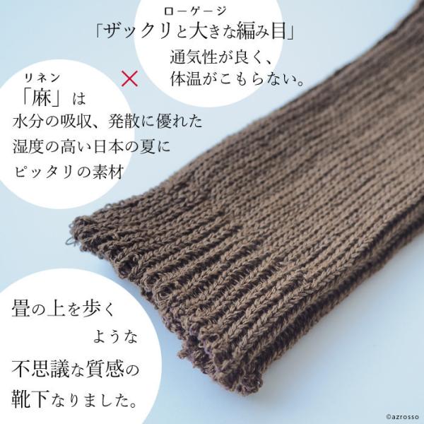 夏素材のリネン(麻)を使って編み上げた「ローゲージソックス」春夏の靴下としては最高。やみつきになる快適履き心地の日本製クルーソックス。リネンの肌にまとわりつかないザクザク感と、通気性が良く熱がこもらない涼しさは、畳の上を歩くのにも似た不思議に気持ちいい質感。履くほどに柔らかく肌になじみ、ゆるっと優しいシルエットの「Branch/リネン」は見るからに涼しげで春夏のお洒落にピッタリ。スニーカーやサンダルでの蒸し暑い日本夏のお出かけ、アウトドア、旅行、ルームソックスとして、毎日履きたい、いつも履いていたい蒸れない日本製高級靴下。