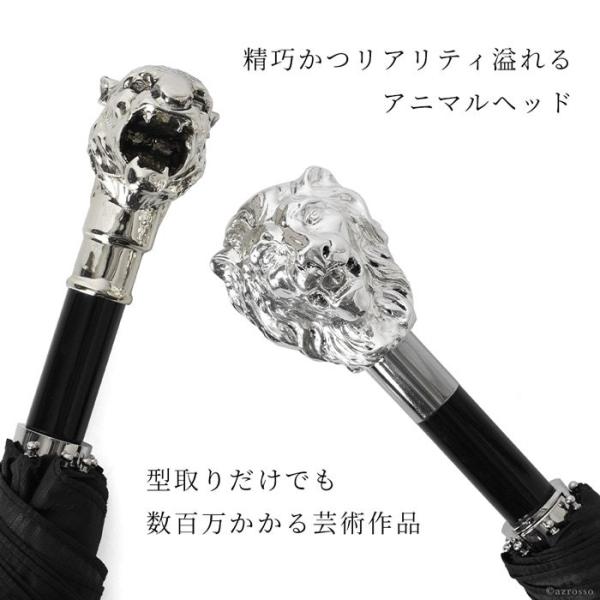 今回ご紹介するのは、ライオンとタイガーをモチーフにした男性用の折りたたみ傘。重厚感のあるアニマルヘッドの持ち手は、力強さと気品を併せ持つ象徴的なデザインで、見る者を惹きつけます。今にも動き出しそうなリアリティ溢れる造形は、型をつくるだけでも数百万円を要するという贅沢な逸品。