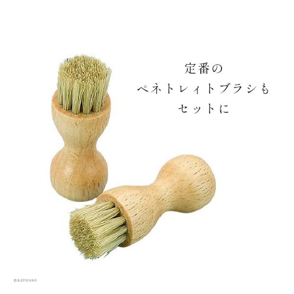 ペネトレィトブラシはクリームの伸びを非常に良くし、米粒2〜3粒程度の量で片足しっかりと行き届きます。浸透性も高く、表面に余分なクリームが残りにくいのが特徴です。