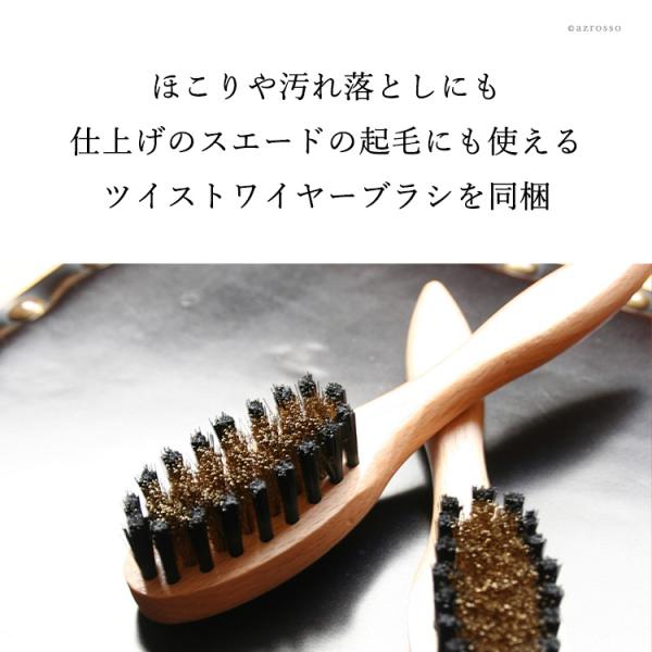 、ツイストワイヤーブラシ。ヌバックなどのホコリや汚れを落しから、仕上げの毛並みを整え起毛する作業までこれ1本。波状のワイヤーを使用しているのであたりが柔らかく、長期使用しても先端が広がりにくいブラシです。