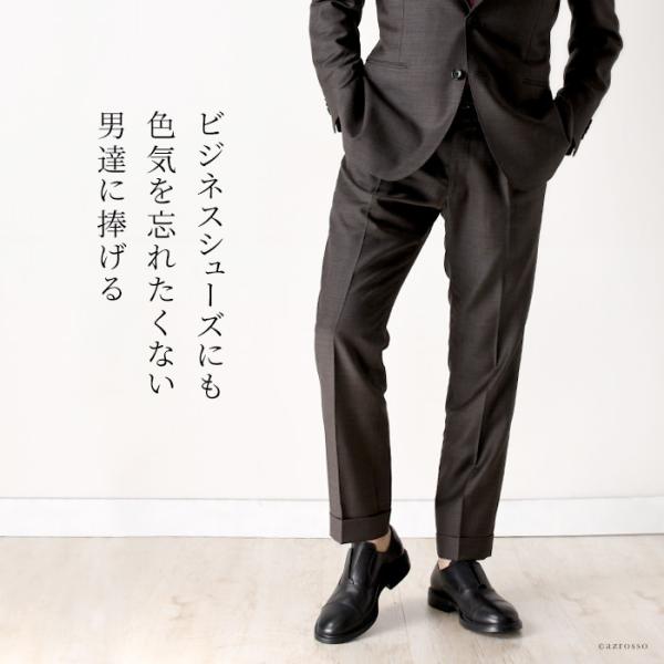 素材とデザインが変わればカジュアルすぎてしまうひもなしスリッポンも、イタリアの上質レザー(本革)とクラシックスタイルを踏襲することでスーツにカチッとはまる。