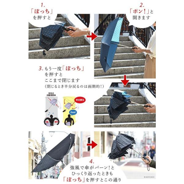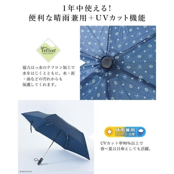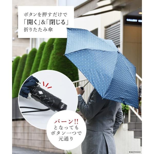 傘がワンタッチで開くジャンプ傘は定番ですが、閉じる際もボタン1つで出来る折りたたみ傘をご存知しょうか。例えば、このようなとき。・雨の日なのに荷物が多く片手がふさがっている・赤ん坊を抱っこしている・幼児と手を繋いでいる時、傘を開閉する時間がもたつく・バスや車(タクシー)などでの乗り降りのとき傘の開閉にてこずる。雨の時にはとにかく傘の開け閉めが面倒ですよね。そういうときに親指1本で開閉できる便利な折り畳み傘はとても便利。こちらの自動開閉傘 ラクローズは、もし強風が吹いて傘がバーンと裏返しになっても、手元のボタンを押せばすぐに元通りになるという高い機能性を持っています。その上、戻るときは、棒が一般的な自動開閉傘よりもたくさん手前に戻るため、傘の収納がとても楽。雨傘としても使い勝手が良いのですが、UVカット効果ありなので、夏は日傘としてもお使いいただけます。強力撥水のテフロン加工で、雨や汚れをしっかり弾きます。旅行やスポーツ観戦、お子様のイベント時、ゴルフのお供にも最適。クールでおしゃれな小紋柄(こもん柄)の男性用傘(メンズ傘)は お父さん(父親 義理の父)への父の日ギフトや誕生日プレゼントにもおすすめ。