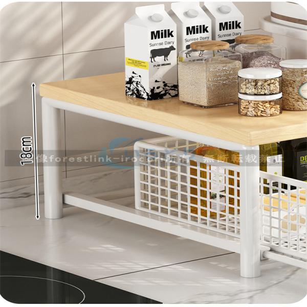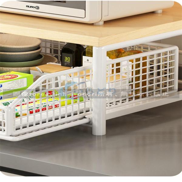 二段式設計で収納性と使いやすさを両立。上段の木天板には調味料、食器、コーヒーメーカーなどを置けるほか、下段の網目バスケットはスムーズに引き出せるため、野菜や雑貨が一気に取り出せます。層別収納で台所の混乱を解消し、空間利用率を大幅にアップ。