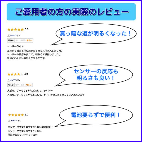 ・人が近づくことで自然にセンサーライトが点灯しますので、不審者が玄関やお家に近づくことを躊躇わせます。また夜帰ってきたときにも自動で玄関を照らしてくれますので、鍵を開ける際にも鍵穴がしっかりと見え便利です。ご家族を守る防犯ライトとしてオススメです。