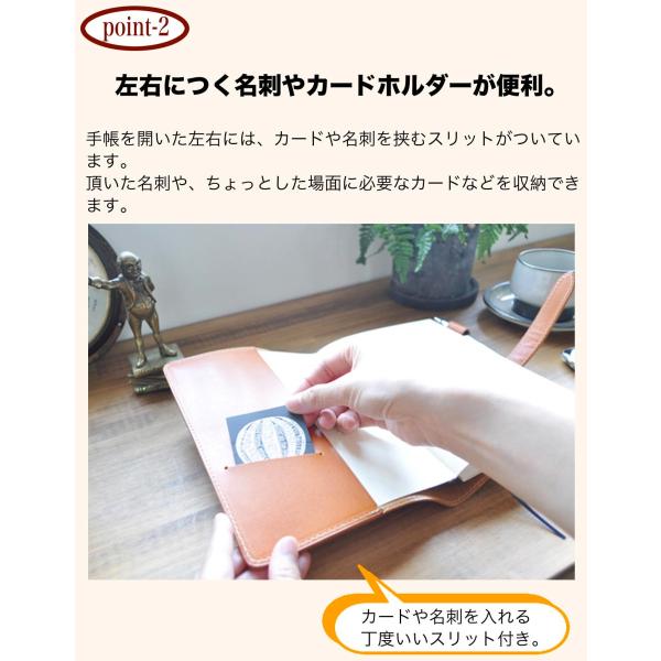 カードや名刺が挟めるスリット2箇所。ペンホルダー(ペン差し)付き。ロゴが刻印された差し込み式のベルト。