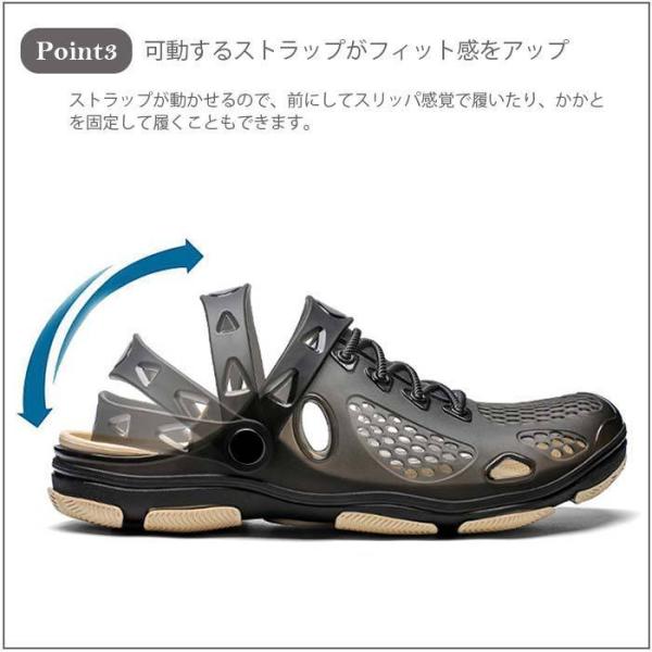・フィット感・速乾性 軽い履き心地と快適なクッション性を実現!空気と水が通り抜けるポートがあり、速乾性抜群!フィット感を高める調整可能なストラップ付き。