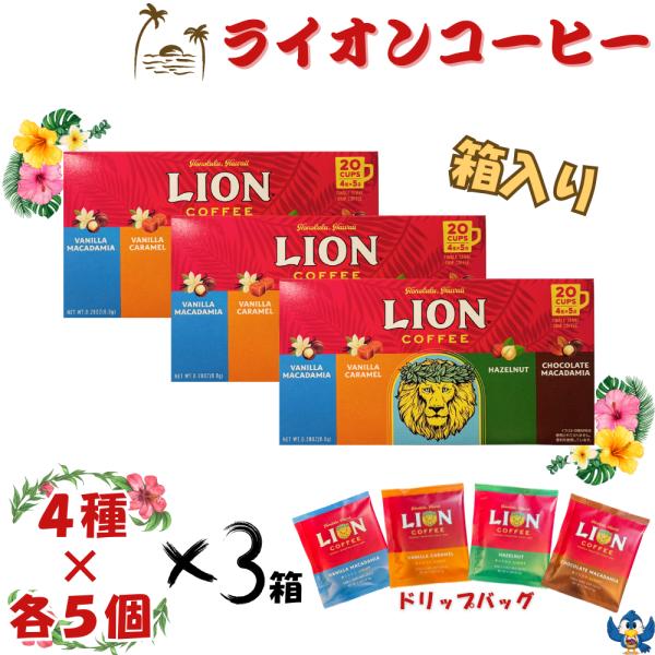 ライオンコーヒー ドリップ 4種 x 各15個 合計60個 バニラマカダミア バニラキャラメル ヘーゼルナッツ チョコマカダミア 中挽き ハワイアンコーヒー