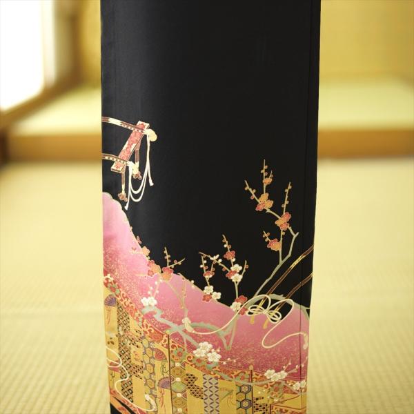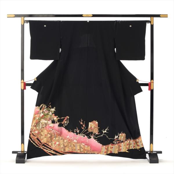 留袖とモーニング同時注文で10%OFF 留袖 レンタル 結婚式 夏用 単衣 ピンク幔幕花車 身長 150cm〜162cm位 黒留袖 レンタル 夏 着物レンタル 母親 高級 正絹