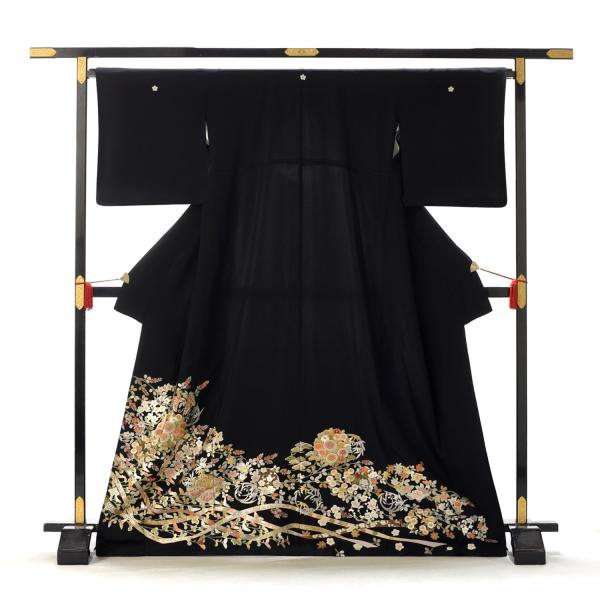 留袖とモーニング同時注文で10%OFF 留袖 レンタル 結婚式 夏用 単衣 こがね雪輪四季の花 身長 150cm〜161cm位 黒留袖 レンタル 夏 母親 高級 正絹