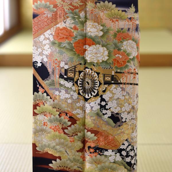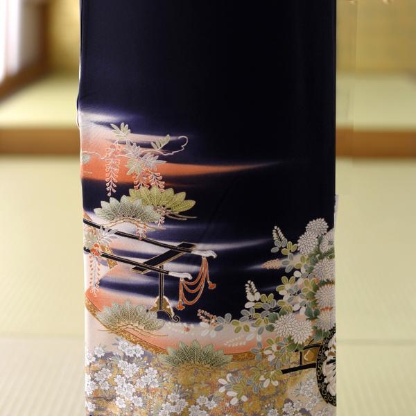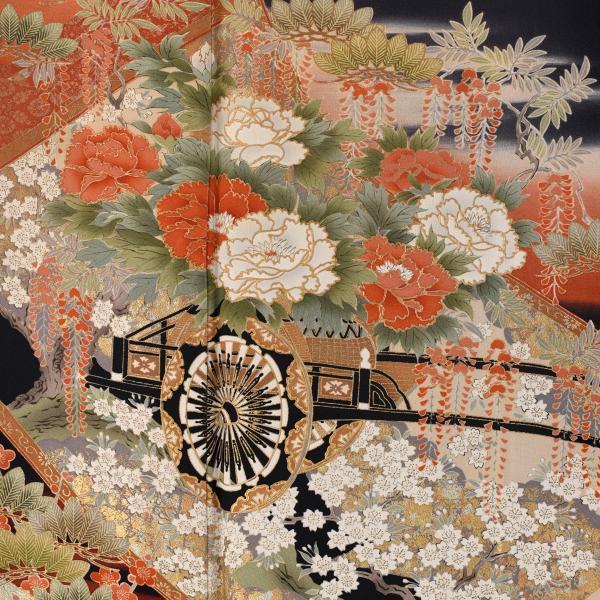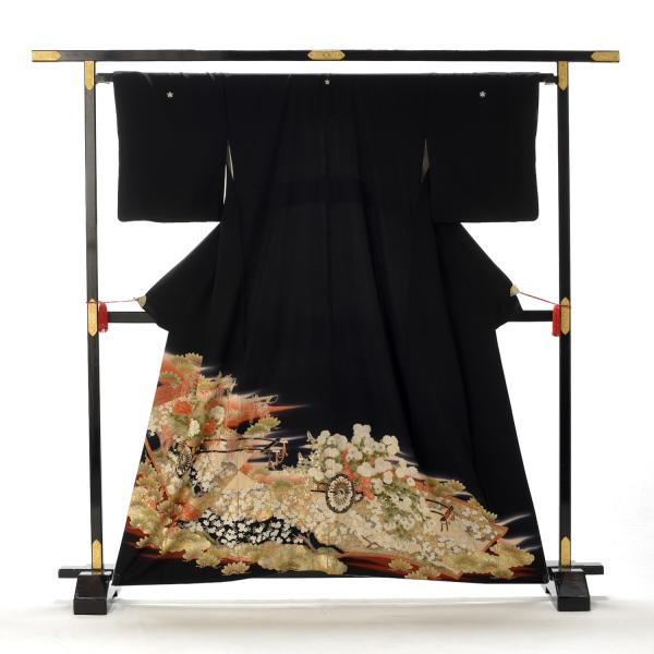 留袖とモーニング同時注文で10%OFF レンタル 留袖 弥生の花車《身長》141cm〜153cm位 高級 正絹 着物レンタル 結婚式 母親 親族 貸衣装 黒留袖レンタル 留め袖