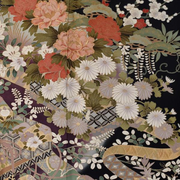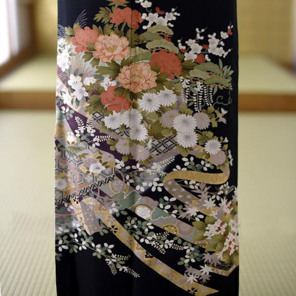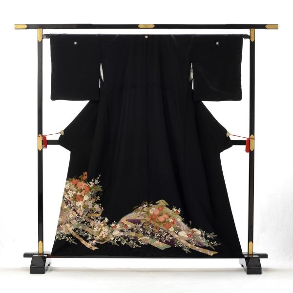 留袖とモーニング同時注文で10%OFF 留袖 レンタル 結婚式 花に文箱《身長》144cm〜156cm位 高級 正絹 黒留袖 着物レンタル 母親 親族 列席者 黒留袖レンタル