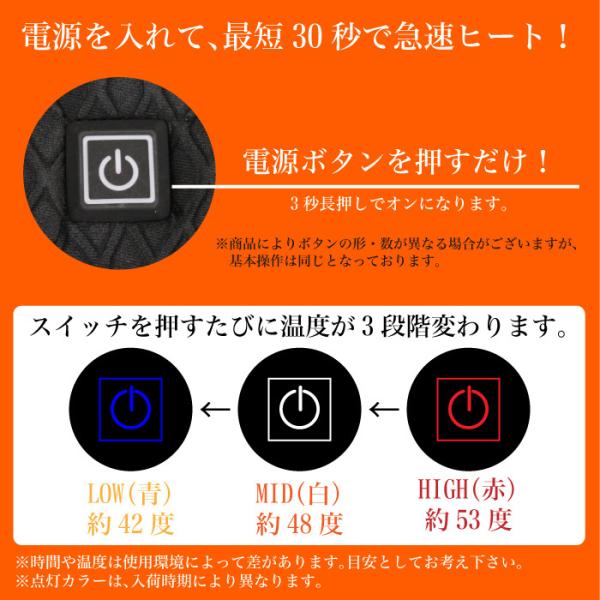 繋いだあとは、胸にある電源ボタンを3秒間長押しして、温まるまで約30秒ほどお待ちください。