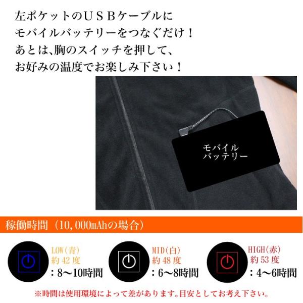 左ポケットのUSBケーブルに、十分に充電されたモバイルバッテリーを繋いでください。