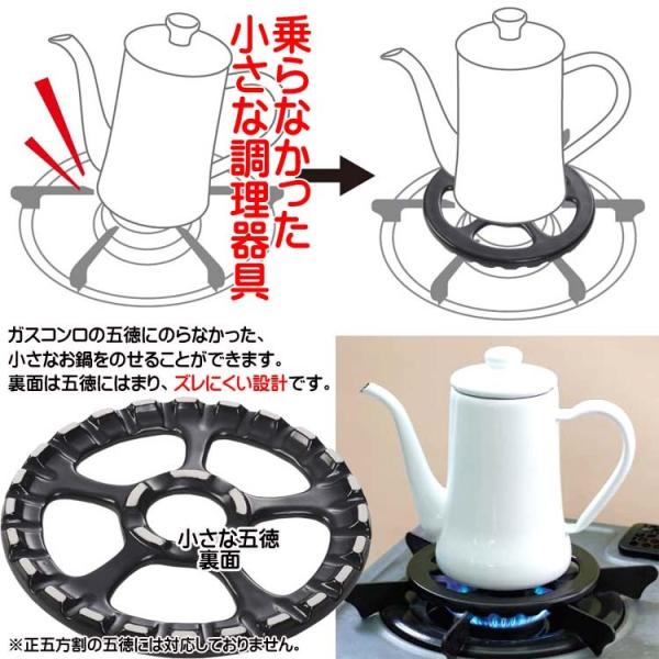 この「ちいさな五徳」を使うと、一般的なガスコンロの五徳にのらなかった、小さなお鍋をのせることができます。鍋底の直径が小さな調理器具をガスコンロの五徳の上で安定させた状態で使用するための補助器具です。小さいお鍋をガスコンロでお使いになりたい方にオススメです。サイズ:直径約14×高さ1.1cm ※中心部分の円の直径3cm 、本体重量(kg):0.12 、素材・材質:耐熱陶器(耐熱セラミックス) 、生産国:日本、
