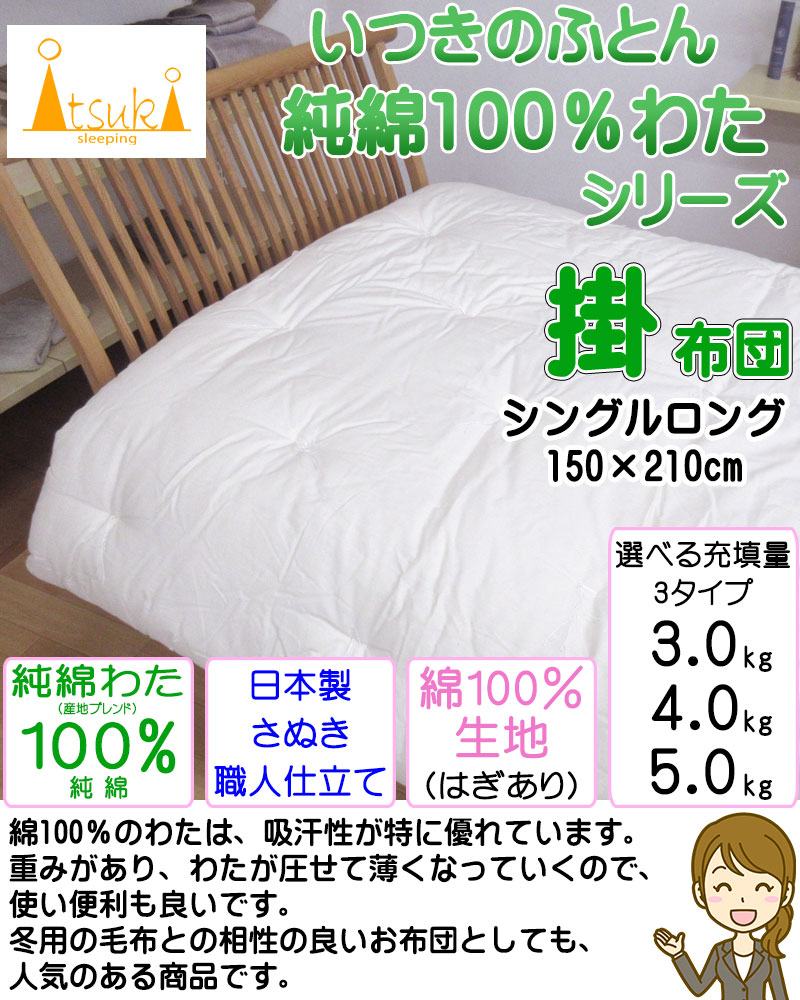 純綿100%ヌード掛布団 8ヵ所ループ付き シングルロング 5.0kg 重みのある 綿100%/掛け布団/日本製/わたふとん/いつきのふとん/重いふとん/送料無料