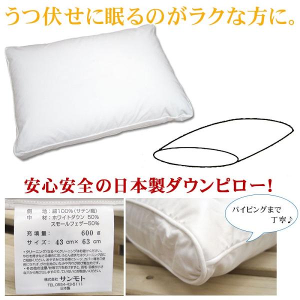 送料無料 ダウンピロー 43×63cm ストマックスリーパー サンモト/日本製/ダウン50%/羽毛/うつ伏せ寝が多い方にオススメ!