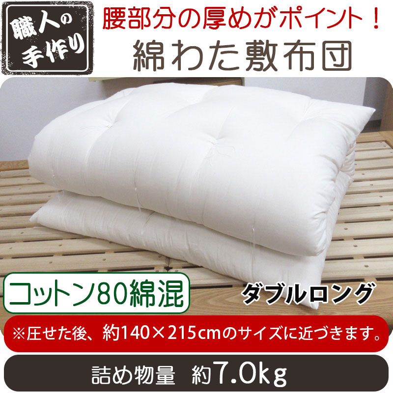 コットン80綿混 綿わた敷布団 約140×215cm ダブルロング 7.0kg/職人/手作り/日本製/和ふとん/敷き布団/和布団/丸めれる/いつきのふとん