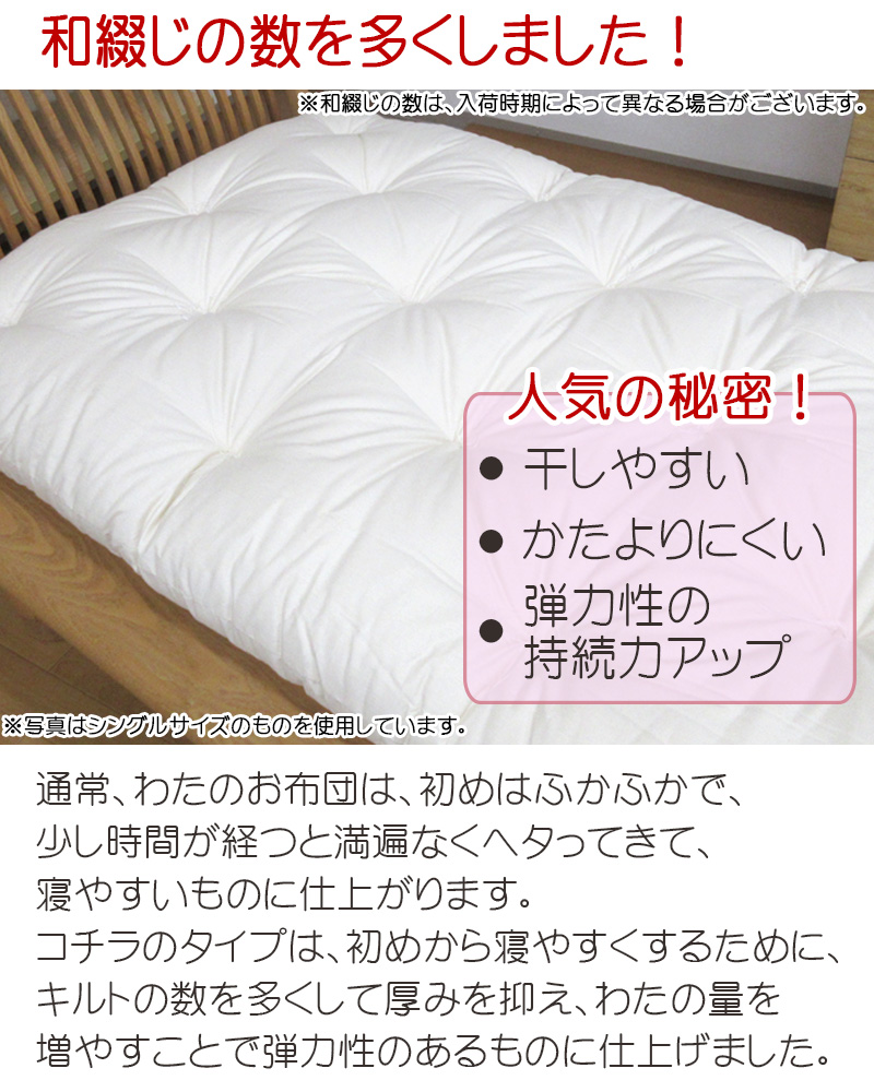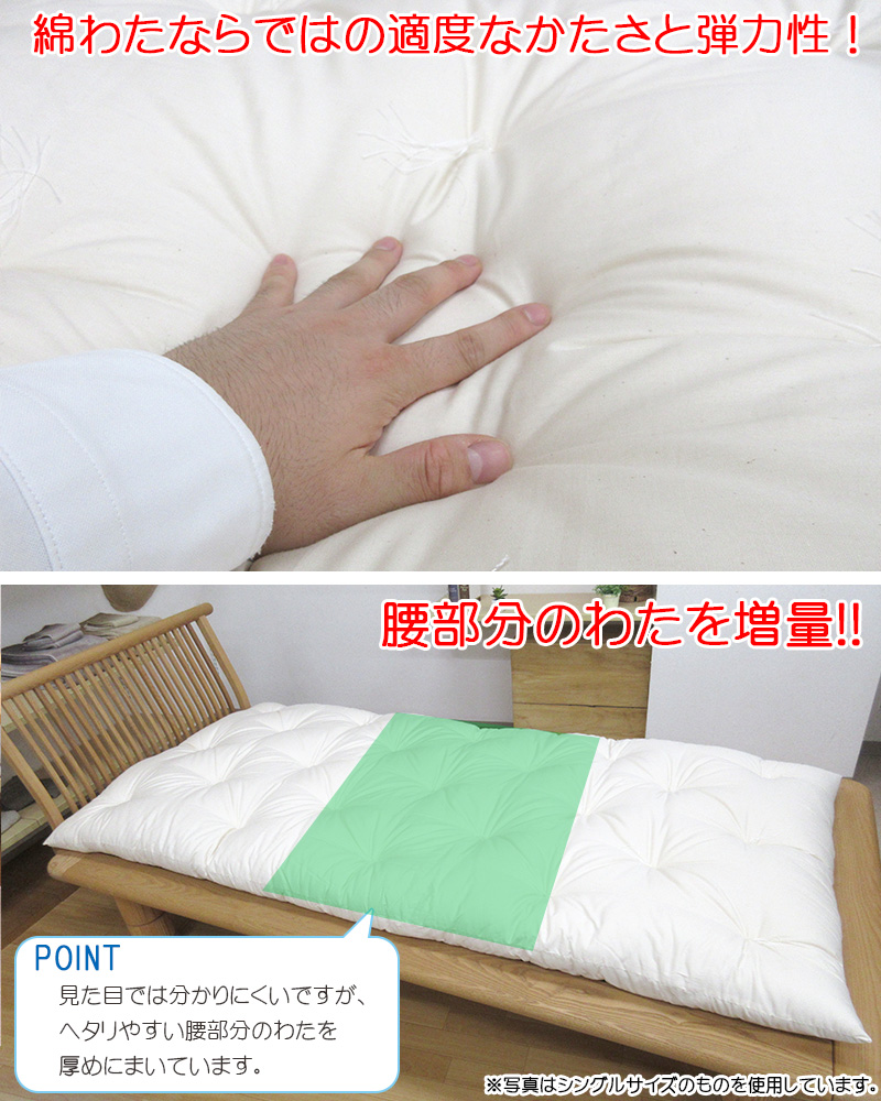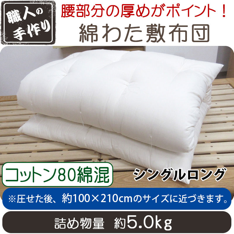 コットン80綿混 綿わた敷布団 約100×210cm シングルロング 5.0kg/職人/手作り/日本製/和ふとん/敷き布団/和布団/丸めれる/いつきのふとん